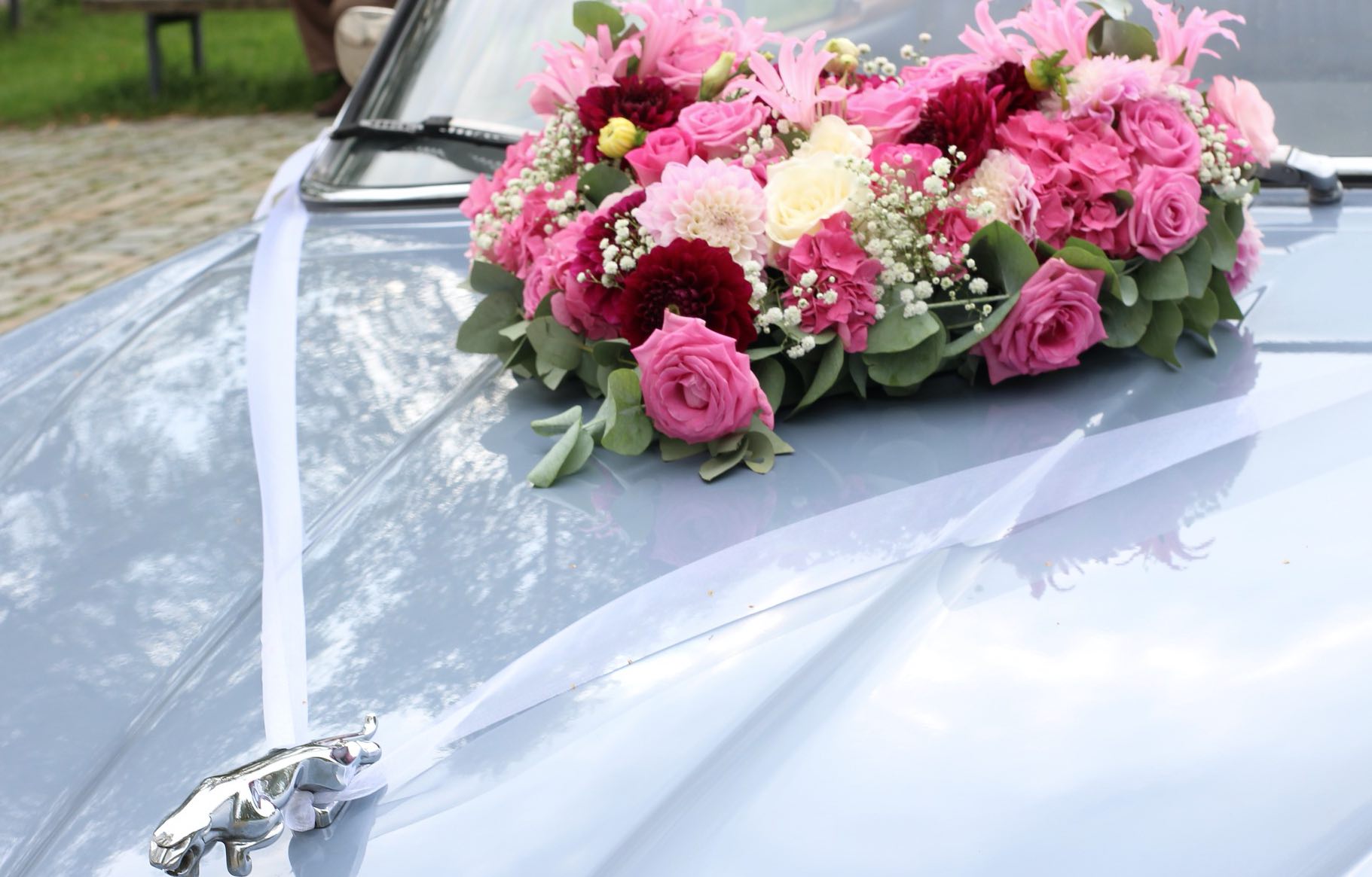 Für eine rundum gelungene Hochzeit gehört der Schmuck des Brautwagens mit dazu. Ob weiße Girlanden, Rosengirlanden, Tüll-Pompons oder Satinbänder. Als Hochzeitsplaner im Großraum München und Augsburg kümmern wir uns um die Gestaltung des Hochzeitsautoschmucks persönlich. Hierbei achten wir auf die Verkehrssicherheit, so dass der Wagen keinesfalls beschädigt wird. Denn auch mit Saugnäpfen angebrachter Autoschmuck für die Hochzeit kann Spuren am Lack hinterlassen. Und mit Saugnäpfen angebrachter Brautschmuck setzt eine Höchstgeschwindigkeit von maximal 50 km/h voraus. Fahren Sie schneller, nehmen wir das Blumengesteck und die Dekoration ab, damit der Brautwagen keinen Schaden erleidet.